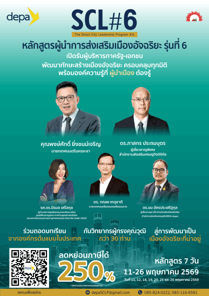 - Digital Economy Promotion Agency (depa), an agency under the Ministry of Digital Economy and Society Together with Noname IMC Company Limited, we organized a training course for leaders in promoting smart cities (Smart City Leadership Program: SCL), Class 6. The course content covers guidelines for creating livable smart city projects. Application of digital technology in all dimensions, both public and private sectors including driving the development of smart cities.