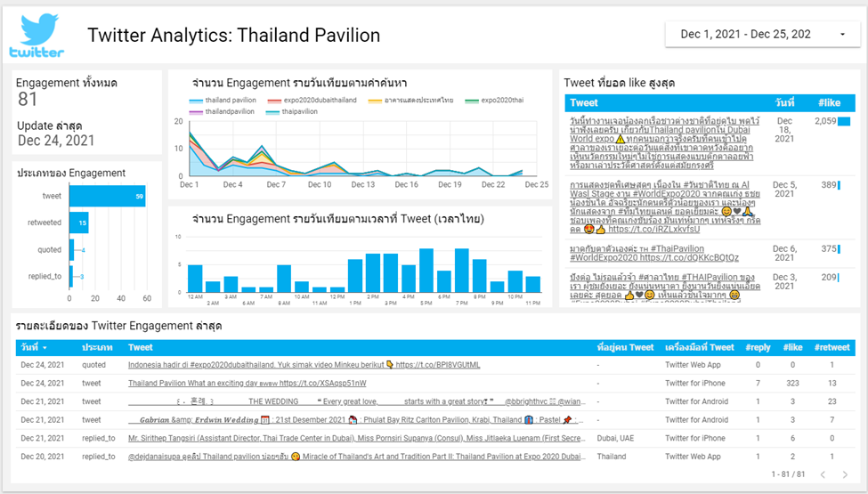 แดชบอร์ดแสดงผลตอบรับของอาคารแสดงประเทศไทยในงาน World Expo 2020 Dubai บน Social media https://bit.ly/3DTezMK
